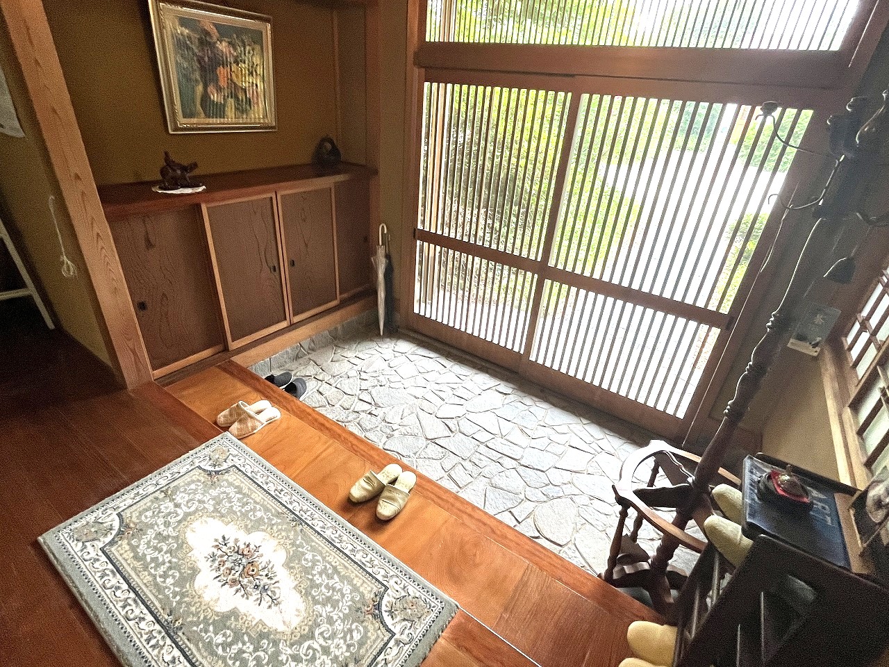 玄関は格子戸で光が差し込み明るく広い空間です♪