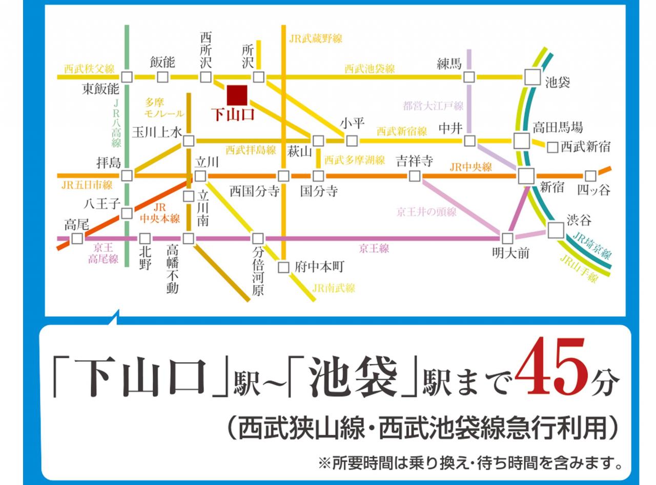下山口駅 744m 西武狭山線の駅。住宅地や学校に近く、通勤・通学に便利な地域駅