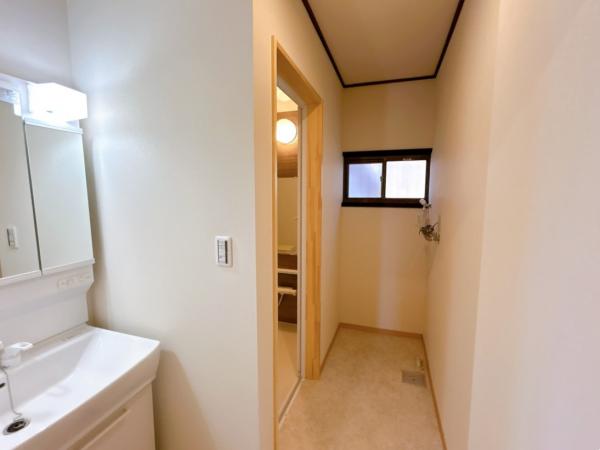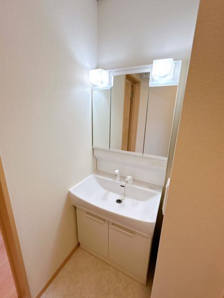 【リフォーム済】新品の洗面化粧台は三面鏡タイプを採用しました。朝の支度がしやすく、見た目もすっきりします。