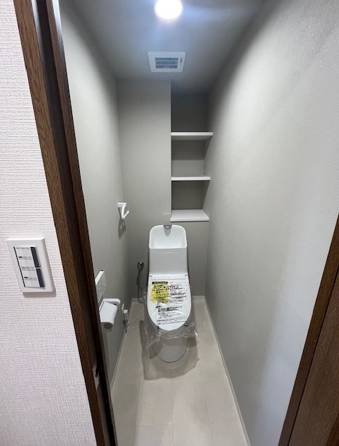 温水洗浄便座付きトイレ。小物を整理出来る棚が付いています。