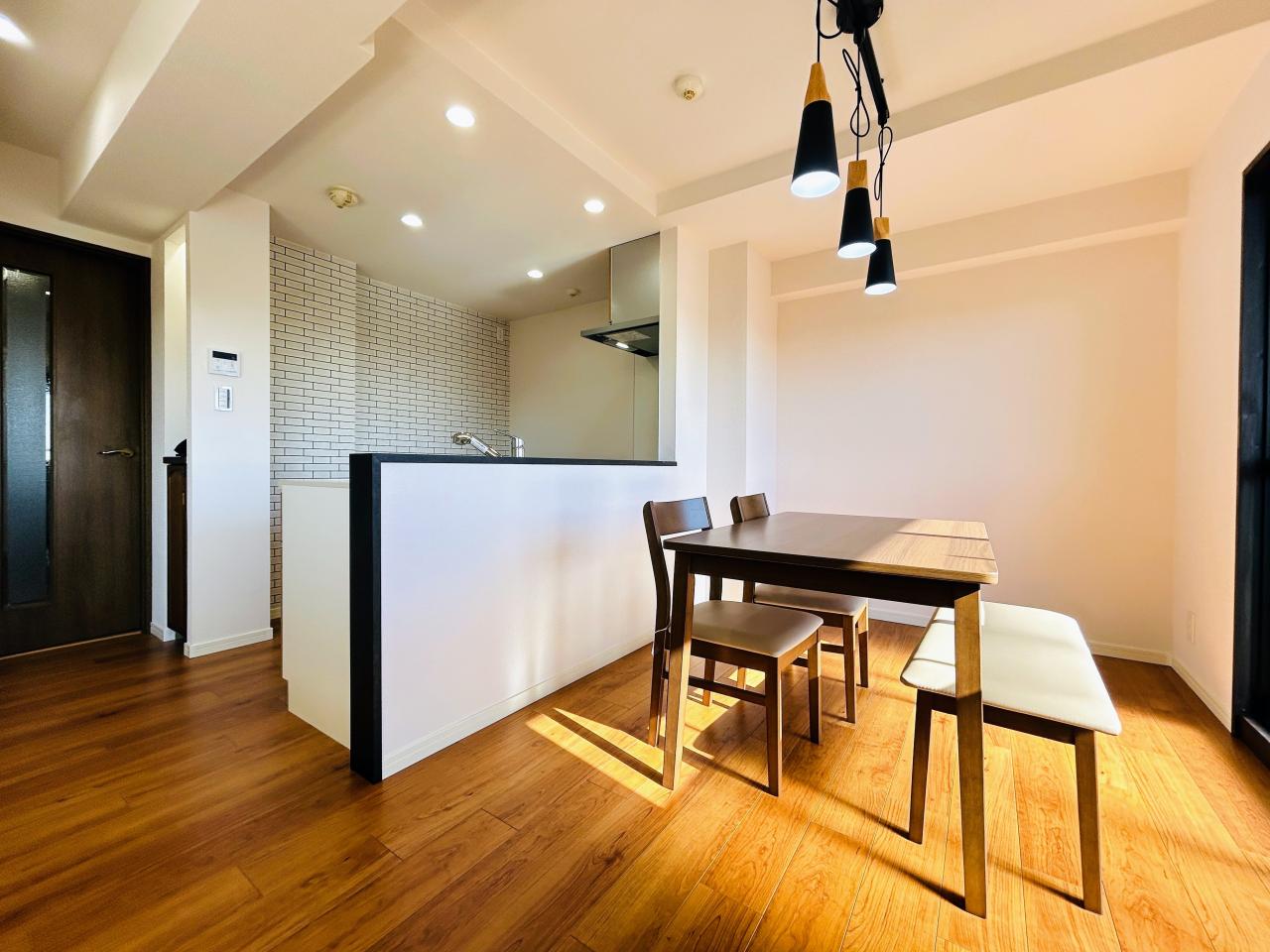 15.5帖の明るいLDK。対面キッチンなので、家族の様子を見ながら家事が出来ます。室内設置の家具は【物件と一緒にお引渡し】となります
