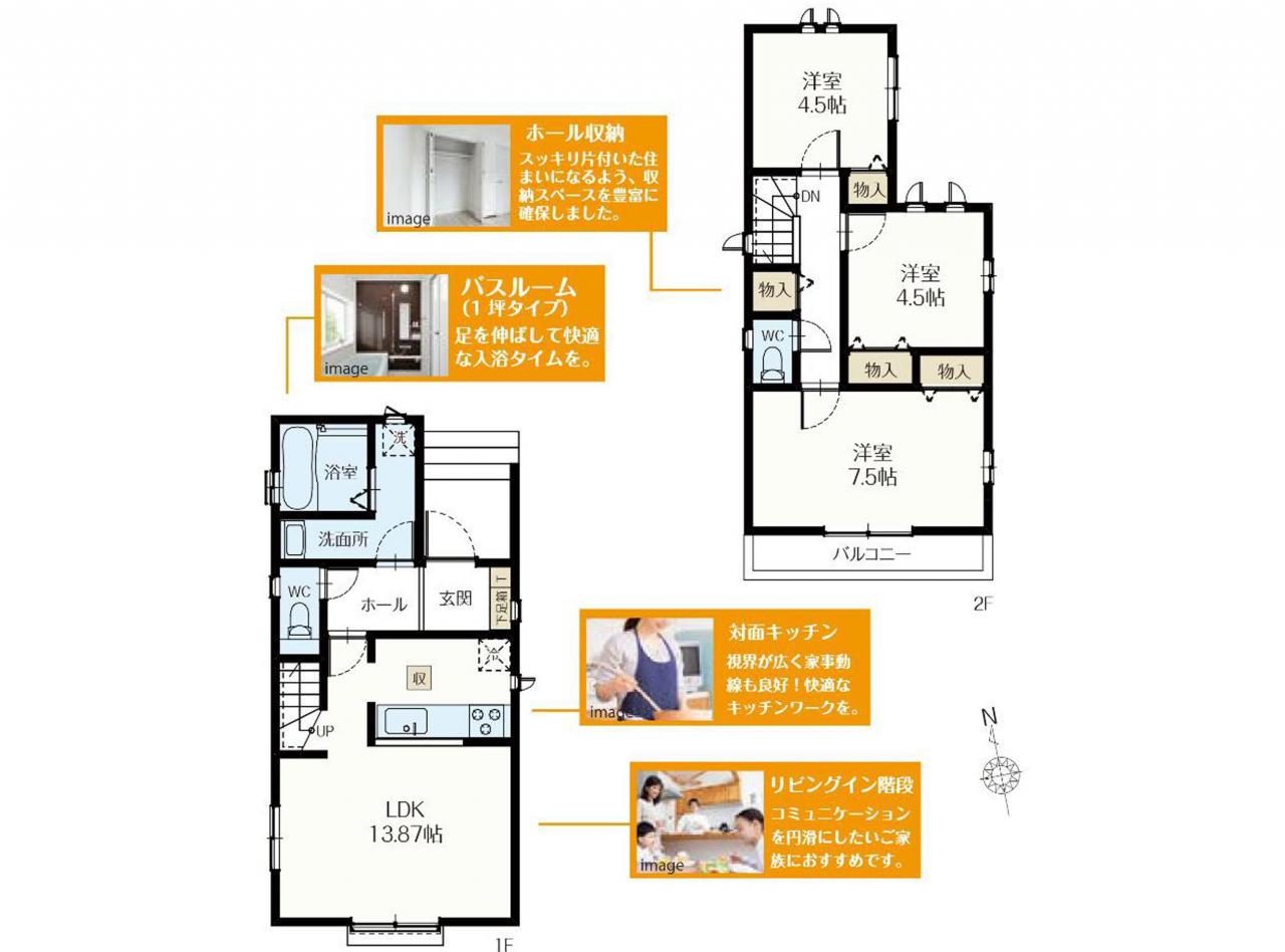土地面積95.28m2、建物面積75.76m2、3LDKの収納豊富な新築住宅です♪