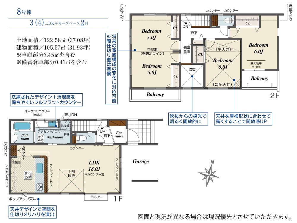 土地面積122.58m2、建物面積105.57m2、8LDKの収納豊富な新築住宅です♪