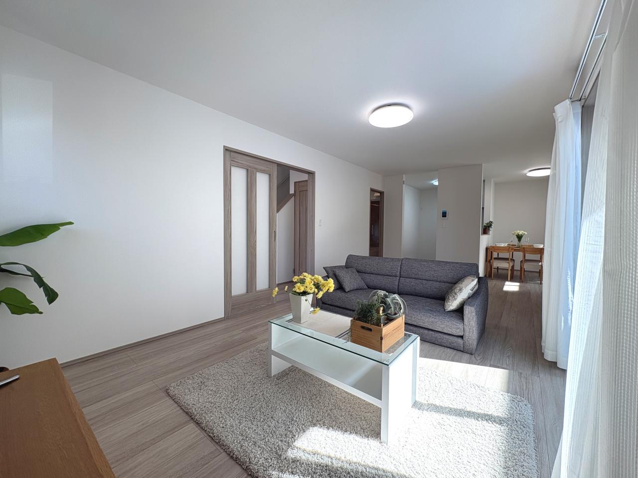 駐車スペース1台付き、ゆとりある広さの約20帖リビング、全室収納付きの居室4室を備えた4LDKです。