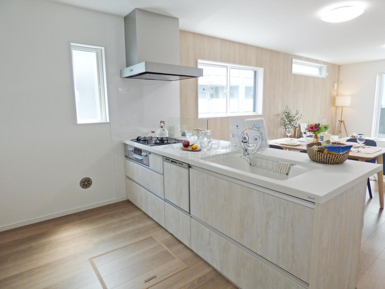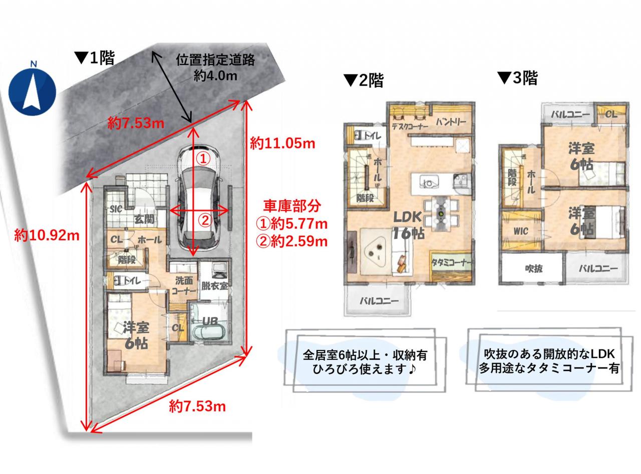 土地面積74.10m2、建物面積111.77m2、3LDKの収納豊富な新築住宅です♪