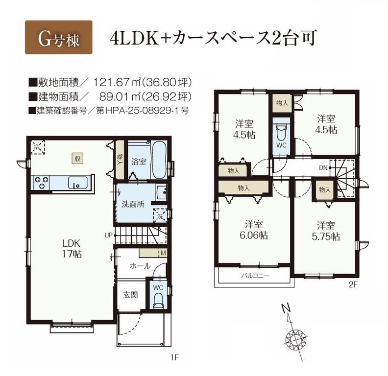 土地面積121.67m2、建物面積89.01m2、4LDKの収納豊富な新築住宅です♪